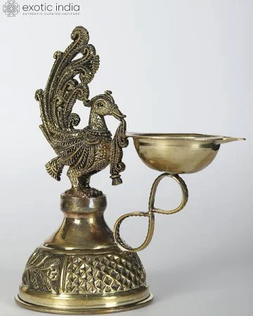 Made of brass (an alloy of copper and zinc) — durable, heat‑resistant, and traditional in many Indian ritual items. It is designed with a peacock motif — either as part of its structure (e.g., peacock figure holding the lamp) or as decorative engravings.